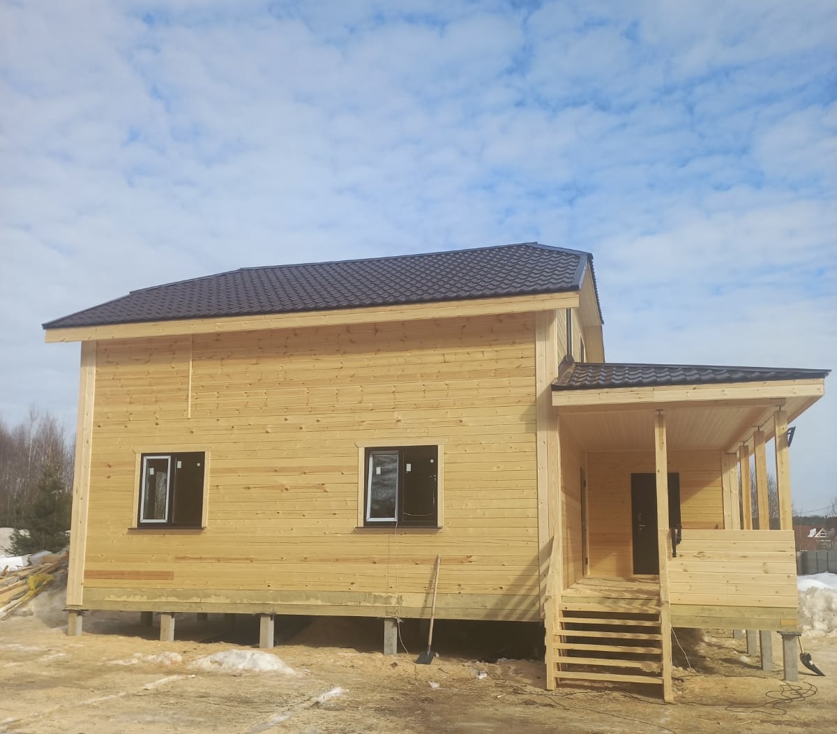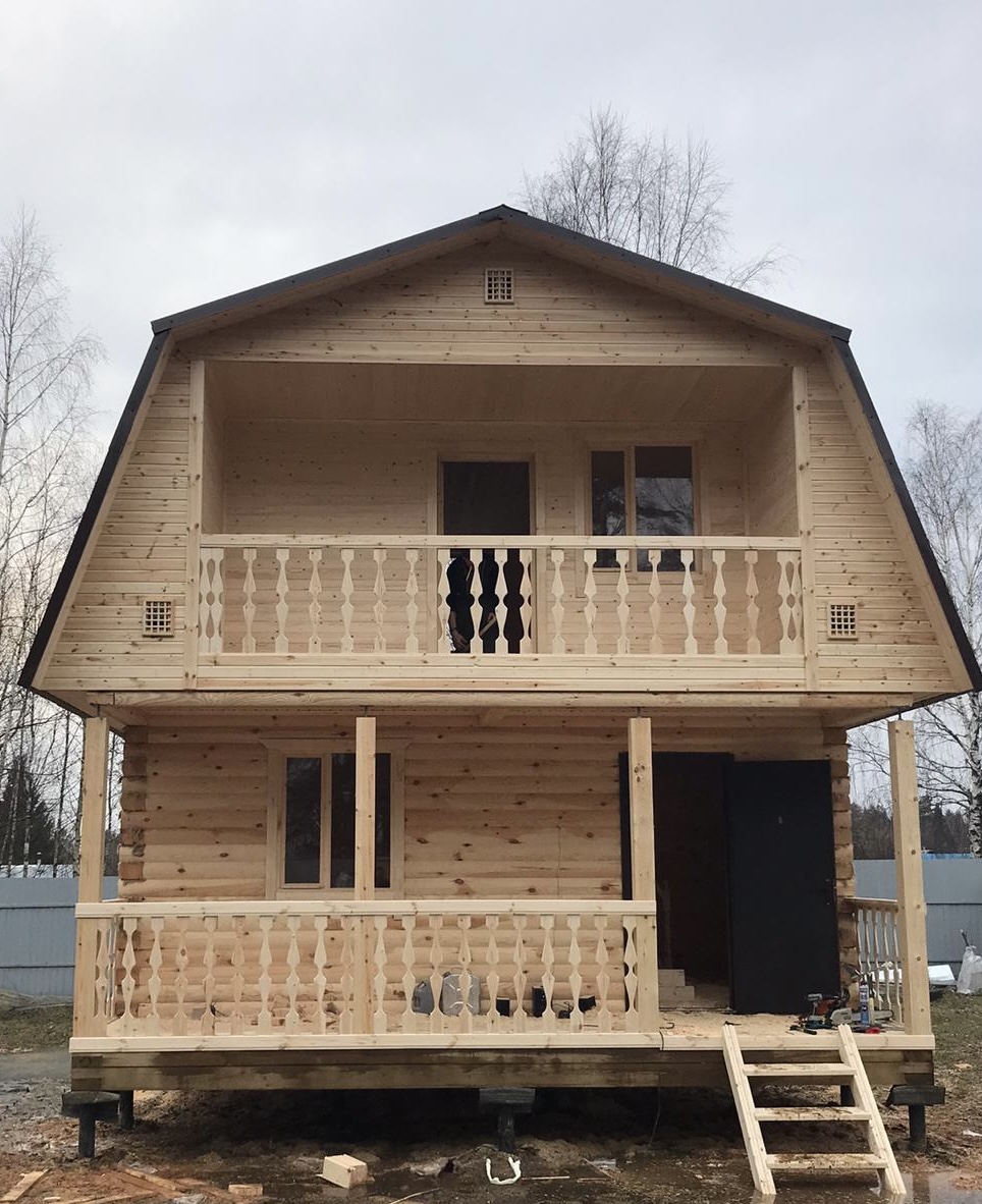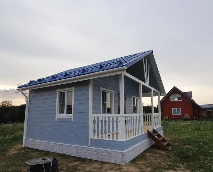 Если на участке не имеется временного жилья для рабочих, фирма доставляет бытовку, и рабочие приступают к строительству дома из профилированного бруса или каркасного дома.